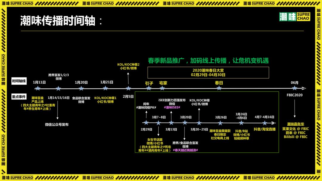 1月-2月,为了助力提报iSEE食品创新力大奖的创新产品以及iSEE新产品推荐,我们通过「SupreChao潮味」微博发起三大话题:#吃货的年终总结# #潮味,让吃货爱上拆箱# #潮味iSEE#,联动食品品牌及跨界品牌,80位KOC/KOLs做话题传播与讨论,共计触达了1000万+消费者,三大话题累计阅读达到4200万,讨论3.5万+。Wave II:潮味春日大赏,从宅家到春日大赏(正在进行中)3月-4月,受疫情影响,春季新品线下推广难以落地成行业难题。由此,我们强势打造线上事件营销「潮味春日大赏」。具体做法为: