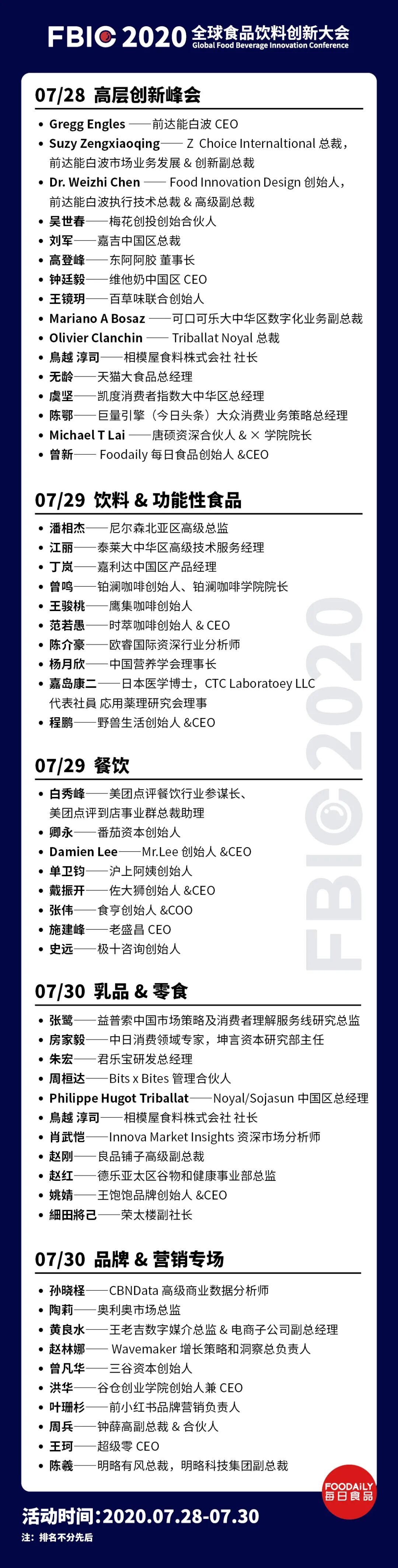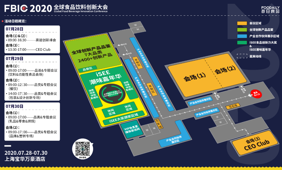 我们始终聚焦“产品&创新”,着眼C端到B端,致力于让每一位参会嘉宾身临其境地去体验并发掘一个个商业机会,并寻找到相应的解决方案。FBIC2020将以“产品体验+创新峰会+品类&主题会议+CEO Club+iSEE食品创新大奖+潮味嘉年华”的形式,深度解读消费者、市场、技术、产品、品牌、体验等创新案例,以达到加速食品行业产品创新、构建产品决策人的创新社交的目的。上周我们给您解读了「创新产品的舞台」章节(点击阅读详情)。本篇文章将为您分享更新FBIC2020「食品开发者大会」的部分日程安排、演讲嘉宾、部分参会企业… 2020年7月28-30日 09:00-18:00全球创新产品体验,iSEE潮味嘉年华,iSEE食品创新力大奖颁奖典礼