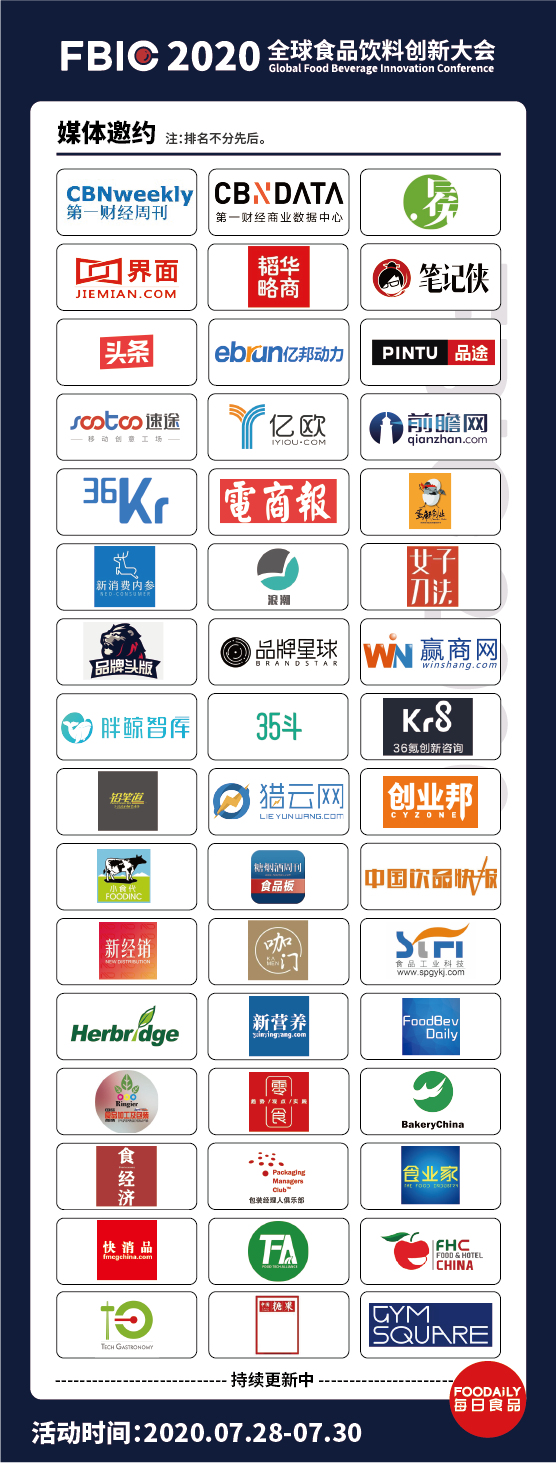 秉承着开放式创新与整体设计创新的理念,Foodaily每日食品携手全球商业&产业合作伙伴共同打造的「FBIC2020全球食品饮料创新大会」,将于7月28-30日在上海宝华万豪酒店举办。