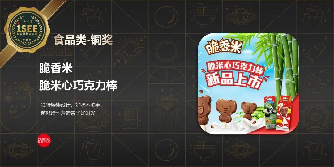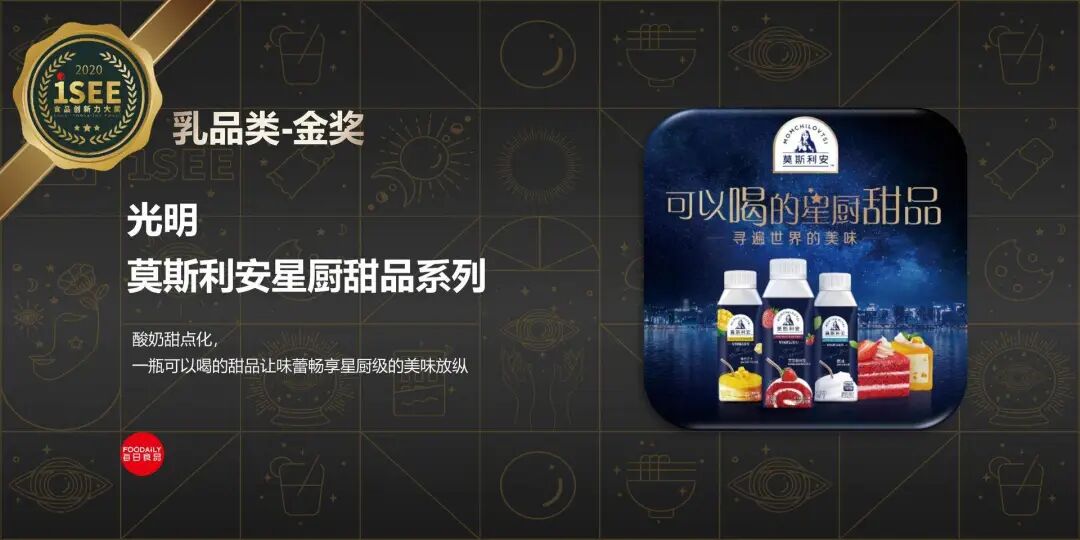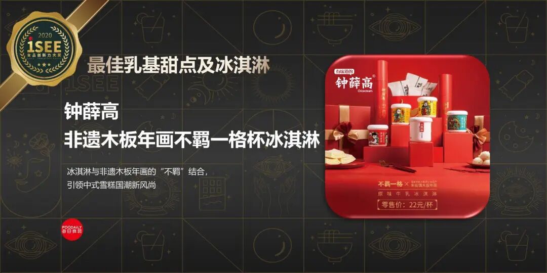 为了“让好的产品被更多人看见”,我们发起“iSEE食品创新力大奖”,并联合第一财经商业数据中心CBNData、唐硕体验咨询、UXDA用户体验创新平台、艾格吃饱了及旗下没事干研究院等共同发力,旨在从产品创新力、消费洞察力、商业表现力、用户体验感等多个维度进行评估,打造一套衡量中国食品饮料行业品牌创新力的黄金标准,借此发现并鼓舞那些勇于捕捉新商业环境下细分领域市场机会的创新势力,共同为食品行业的创新发展凝聚力量,加速赋能。今晚,在Foodaily主办的「FBIC2020全球食品&饮料创新大会」上,“iSEE食品创新力大奖”获奖名单重磅揭晓,200+行业大咖莅临现场。本届iSEE大奖共收到来自130个品牌307个创新食品饮料产品的申请,从百强到最终大奖,今晚我们共同见证了中国食品饮料领域的产品创新盛会。Foodaily「 iSEE产品委员会」综合专业评审和消费者评审的结果,依据不同产品类别评选出了:
