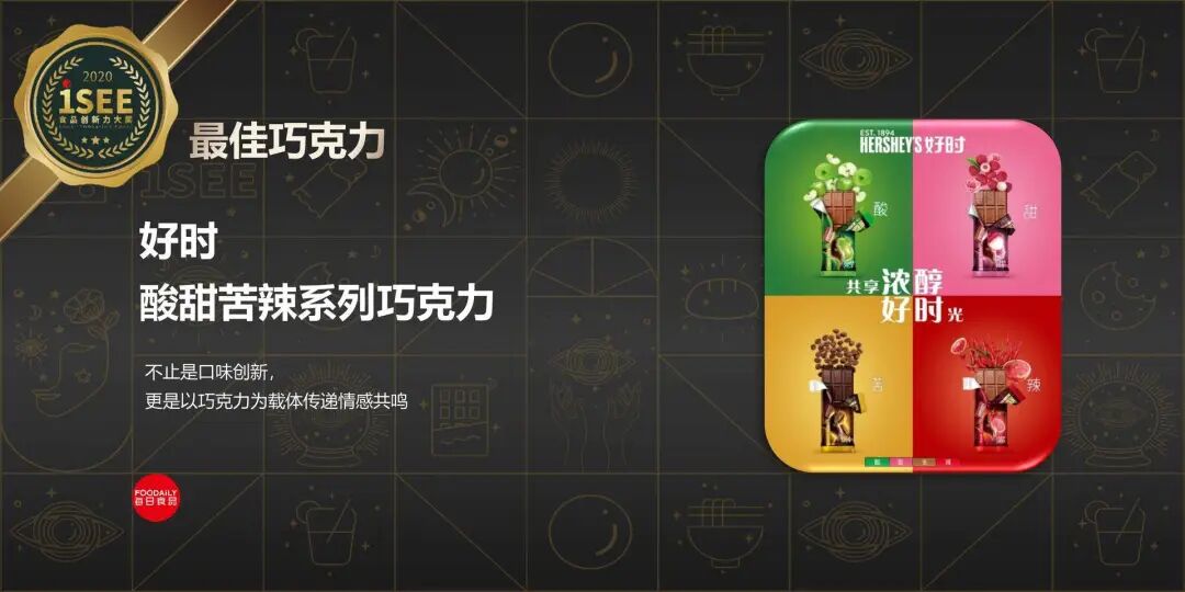 好时巧克力面向通过零食寻求更多新鲜感和情感共鸣的消费者,以及零食口味本土化的趋势,开发出创新的能够代表消费者日常心情与感受的酸甜苦辣系列巧克力。产品面向喜欢尝新的年轻消费者,契合他们对新事物的追求和对每天心情的表达,让美味的口感和美味的心情伴随消费者每一天。酸甜苦辣系列是好时近几年最成功的的新品之一,体现在几个方面:单个系列新品所贡献的销量与市场份额最高;消费者喜爱度最高,零售商的反馈最积极;获得的品牌溢价最高,对提升好时在消费者心目中的创新能力与喜爱度有强烈影响。