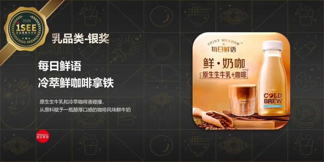 咖啡+鲜牛奶碰撞出醇香滋味,每日鲜语冷萃鲜咖啡拿铁获得「乳品类银奖」。该产品臻选100%来自咖啡黄金地带的阿拉比卡豆,采用德国先进冷萃技术,紧锁咖啡原液原始风味;原生生牛乳和冷萃咖啡液碰撞,从原料赋予一瓶醇厚口感的“鲜”咖啡,15天赏味佳期,不仅锁住咖啡与生牛乳特有的新鲜,还拥有拿铁的浓醇顺滑。