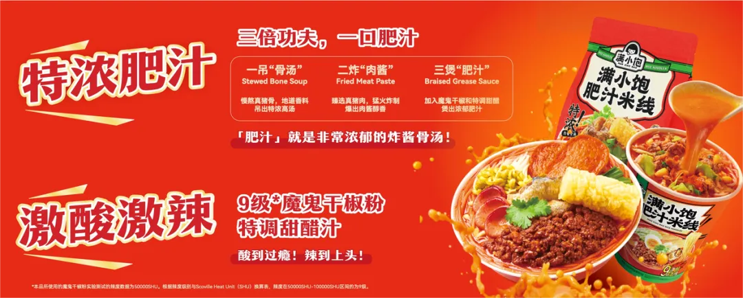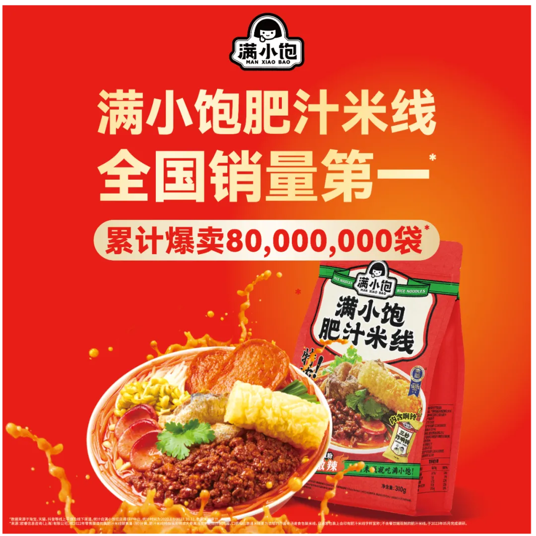满小饱,一直秉持用心做好产品的初心与决心,成功打造了亿级明星大爆品——满小饱肥汁米线,主打“特浓肥汁,激酸激辣”,创造性地将“三秒炸响铃”“爽脆黄豆芽”等火锅场景下的食材融入其中。“特浓肥汁”即【特浓炸酱骨汤】,以豚骨高汤打底,再加入猛火炸酱熬煮,搭配9级魔鬼干椒粉及特调甜醋汁调味,汤浓不见碗底,酸辣爽巨开胃!满小饱一贯坚持用“真”好料、下“笨”功夫去熬制一碗好汤底,任何食材放进去都能煮出美味鲜香,真正实现“万物可肥汁”的品牌憧憬!同时丰富了消费者的食用场景——“一个人的肥汁米线,两个人的肥汁冒菜,三个人的肥汁小火锅”,满足了更多用户的解饿解馋需求。满小饱持续关注用户核心需求的变化,并用实实在在的新产品来满足,在经典大爆品肥汁米线的基础上,又衍生出肥汁拉面(吃面党)、超有料肥汁米线(加料党)、冲泡版肥汁米线(免煮党)等不同的人气畅销品。在未来,满小饱将继续饱持初心,向更多人分享美味和快乐!*仅针对展区观展权益,不包含会议论坛区和奖项区的门票权益