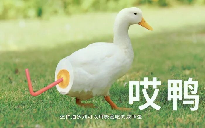 五芳斋致力于企业转型,背后实际上是个关于粽子主业增长的问题。你也许对👇这张图印象深刻:在鸭屁股上戳一根吸管,旁白一句“哎鸭”。这张在社交网站上刷屏的图片出自于五芳斋的咸鸭蛋广告(新编版),广告片在微博上有115万的播放量。这支号称“争当中国广告界的一股泥石流”的广告在B站上表现更好,有232.7万的播放量。